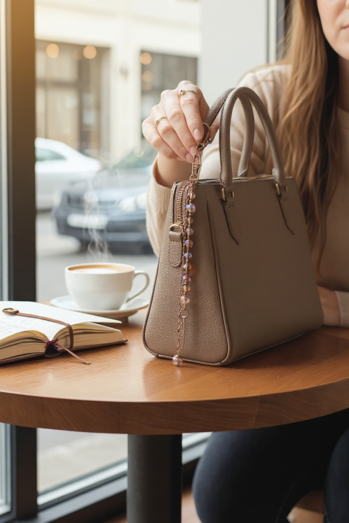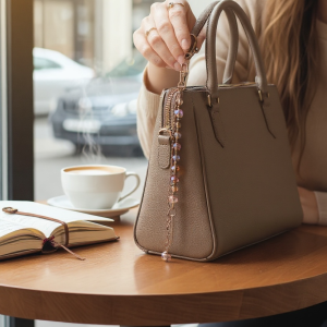 🌟encantador accesorio con cristales en tonos rosa y tierra con delicados colgantes metálicos, creando un toque de elegancia y energía positiva para tu cartera o bolso favorito. Ideal para quienes aman los detalles que reflejan luz🌈