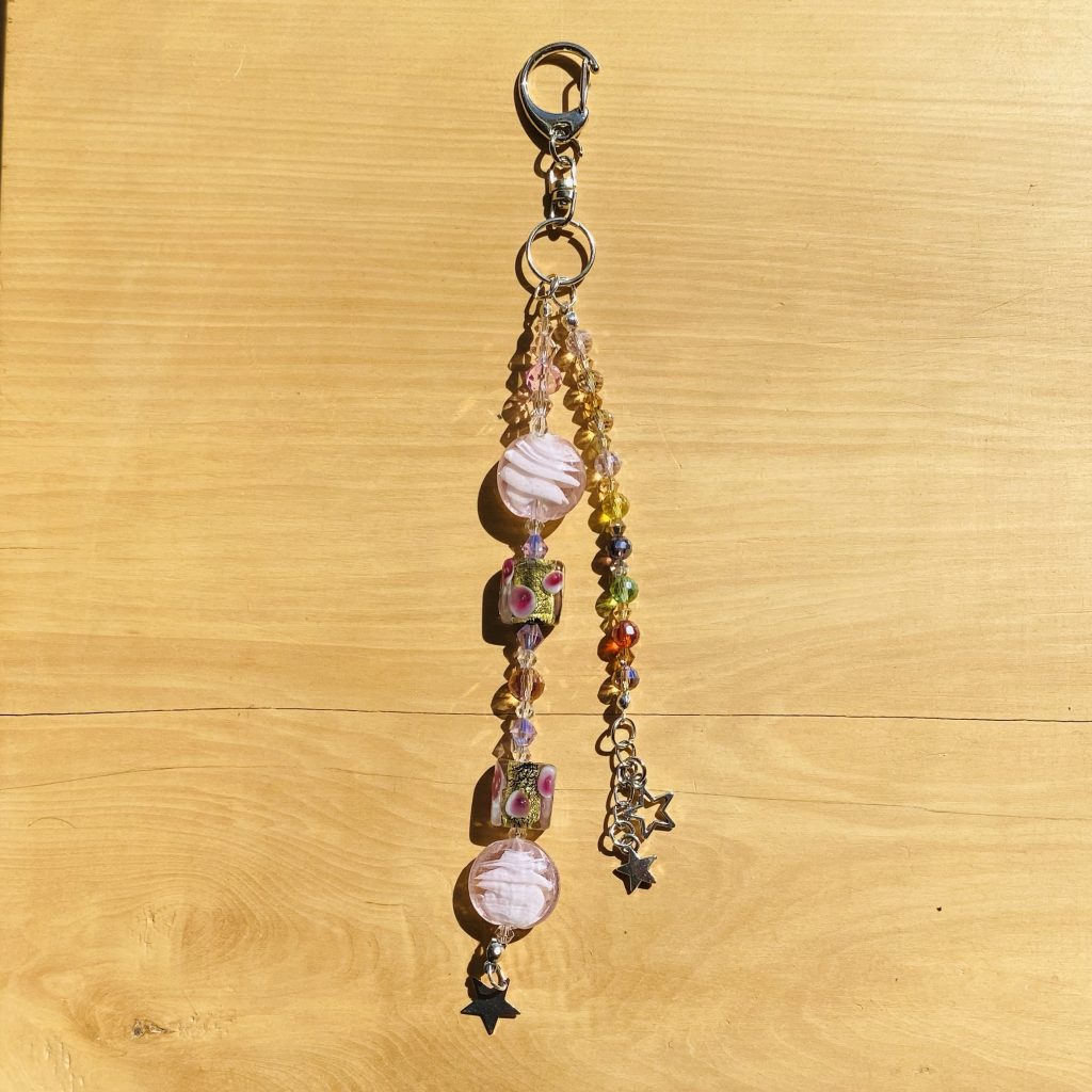 Este encantador accesorio combina cuentas de cristal en tonos rosados y multicolor con delicados colgantes metálicos, creando un toque de elegancia y energía positiva para tu cartera o bolso favorito. Ideal para quienes aman los detalles que reflejan luz