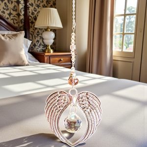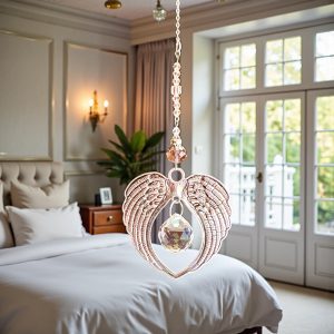 Atrapasol con alas de ángel en tono plata,símbolo de protección y guía espiritual. Su cristal central refleja la luz creando destellos cálidos que aportan armonía, paz y una atmósfera acogedora al hogar. Una pieza especial para decorar en Navidad o durante todo el año, ideal como regalo lleno de significado y buena energía.