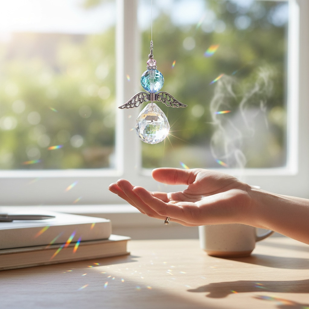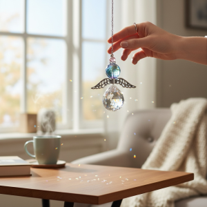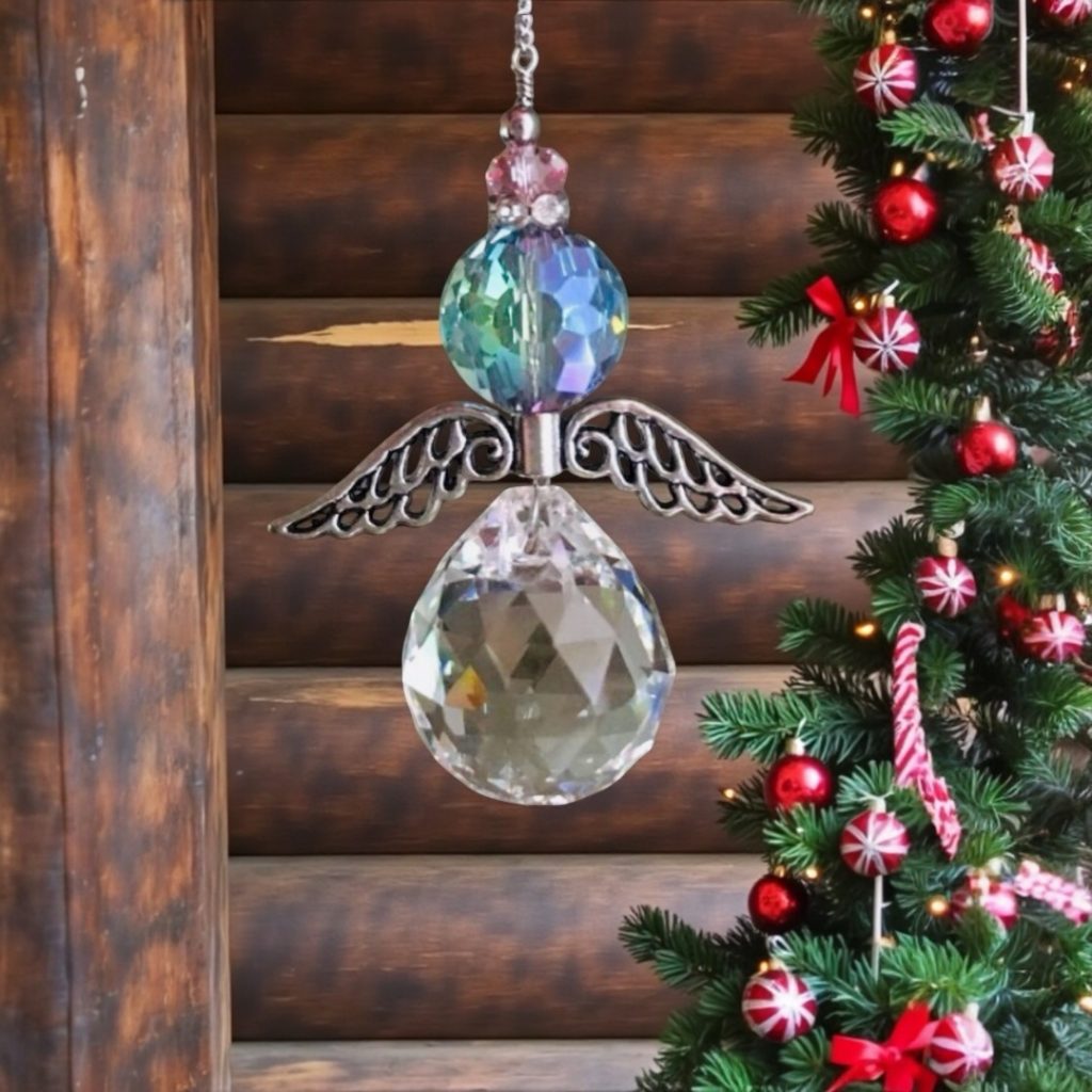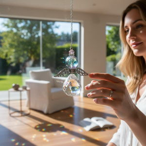 Atrapasol en forma de ángel con delicadas alas metálicas, esfera facetada de cristal transparente y cuentas de cristal austriaco de colores que reflejan la luz de manera mágica. Ideal para decorar ventanas y espacios iluminados, llenando tu hogar de destellos y armonía.