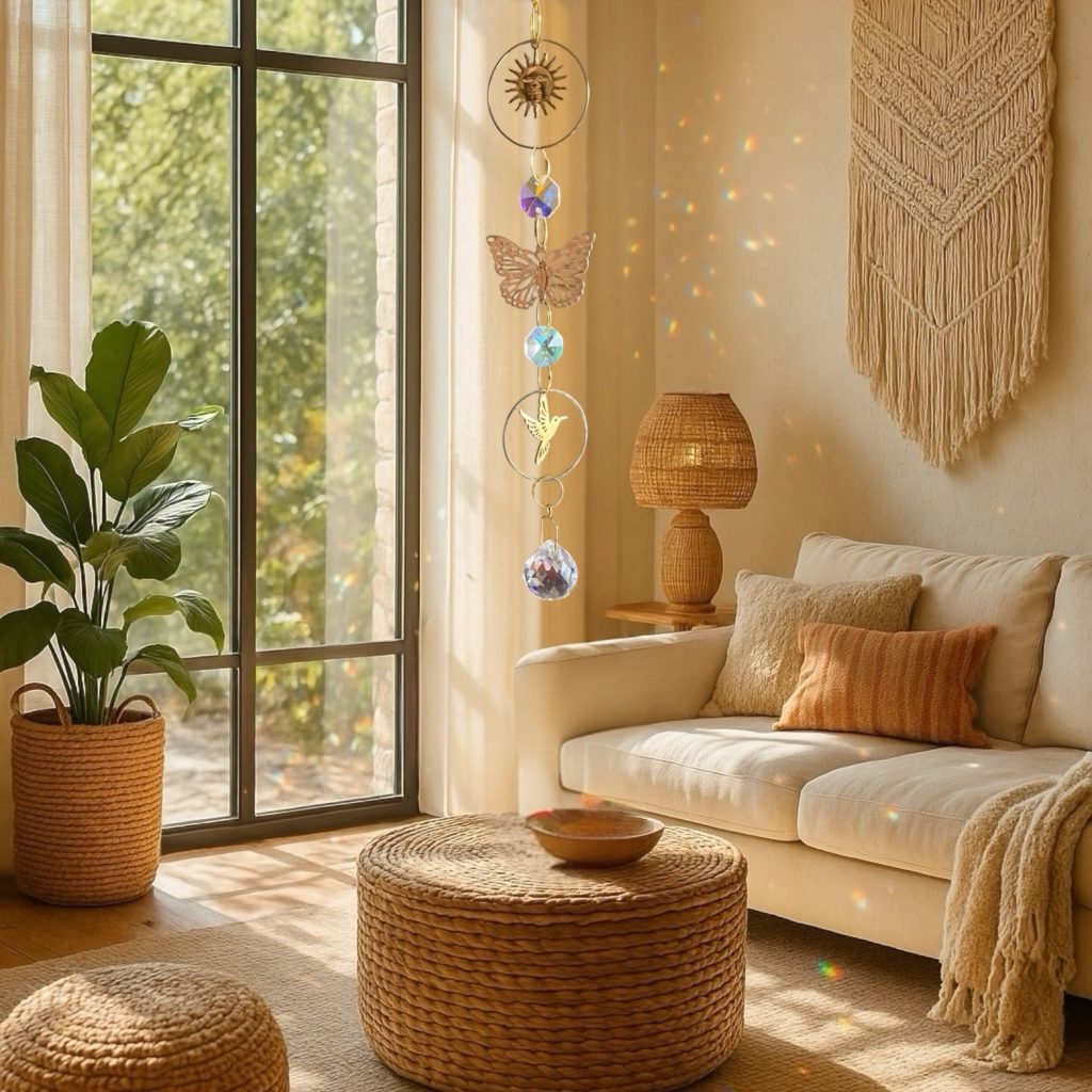 ☀🦋🐦 Atrapasol con sol, mariposa ,colibrí ,cristales austríacos prisma de cristal,hecho a mano, proyecta destellos mágicos que llenan tu hogar de luz, libertad y armonía.
