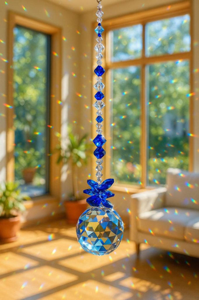 🔷💎 Atrapasol con cristales austriacos en tonos azules con prisma de cristal ✨ hecho a mano, refleja serenidad y proyecta destellos mágicos y protección. 🌈