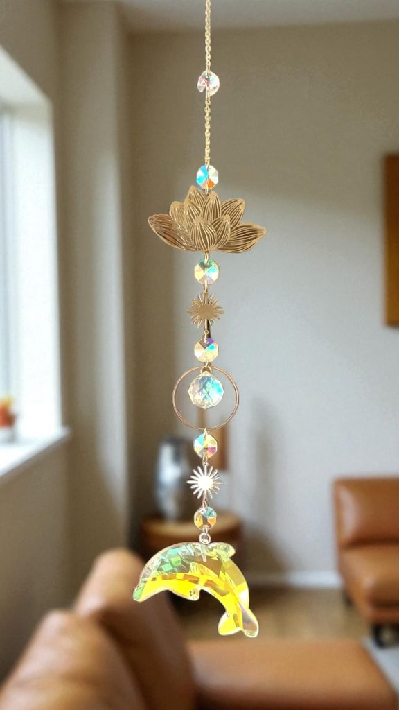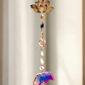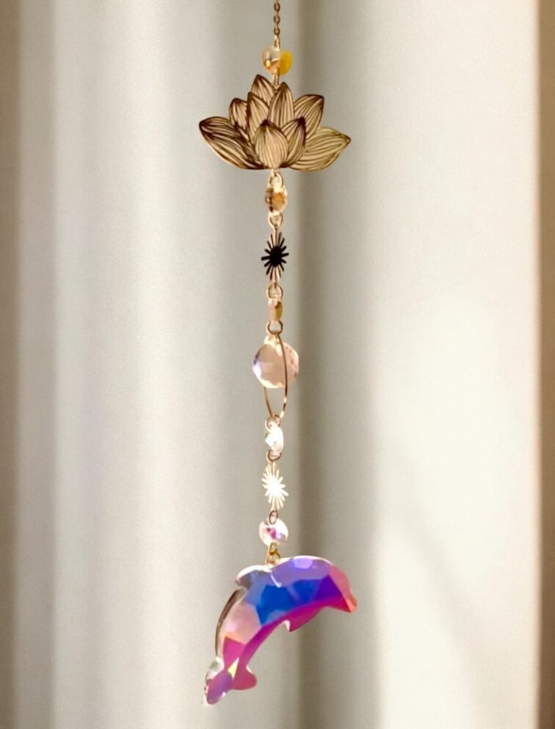 Colgante con loto y delfín en cristal iridiscente que proyecta destellos de luz y llena tus espacios de armonía y frescura marina. ✨🐬🌸