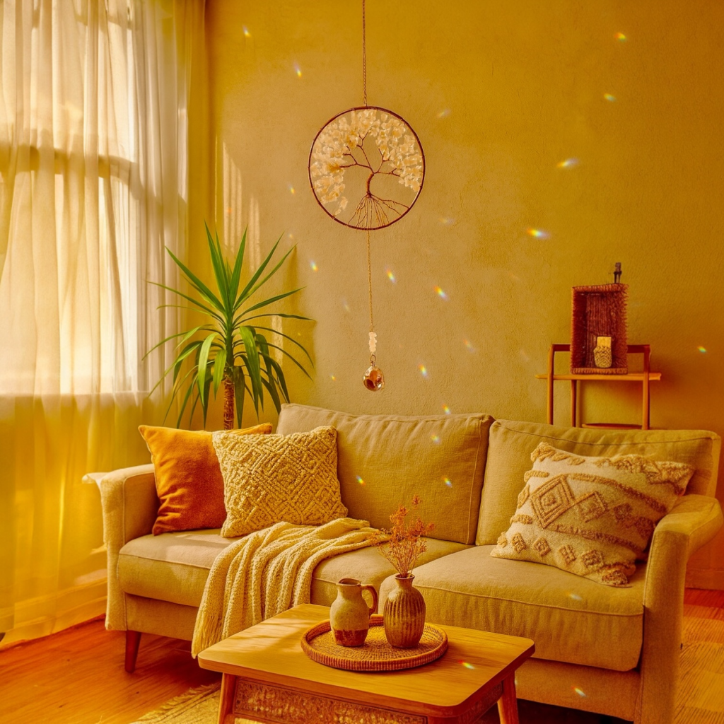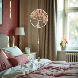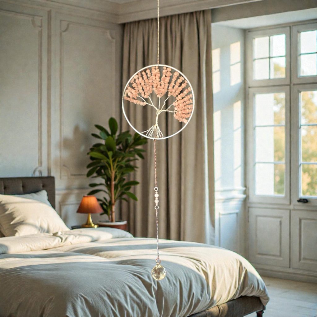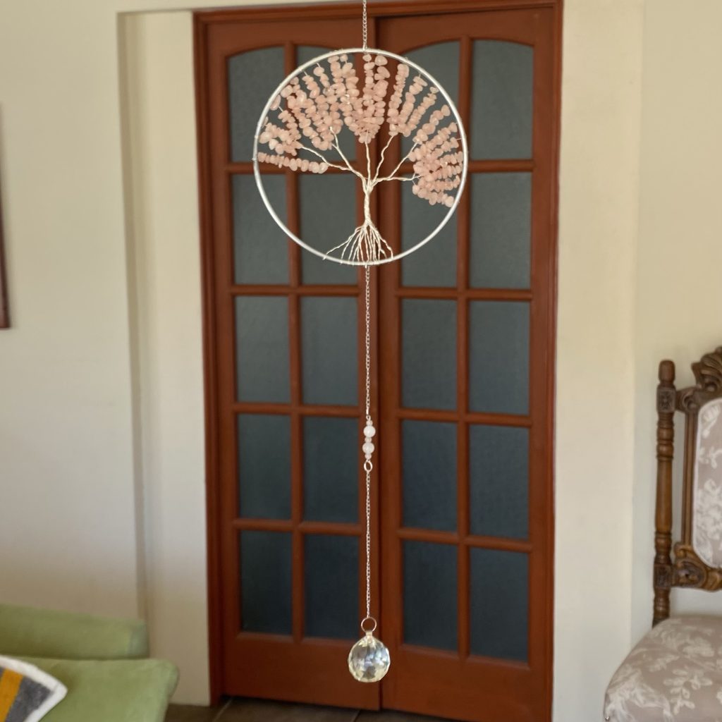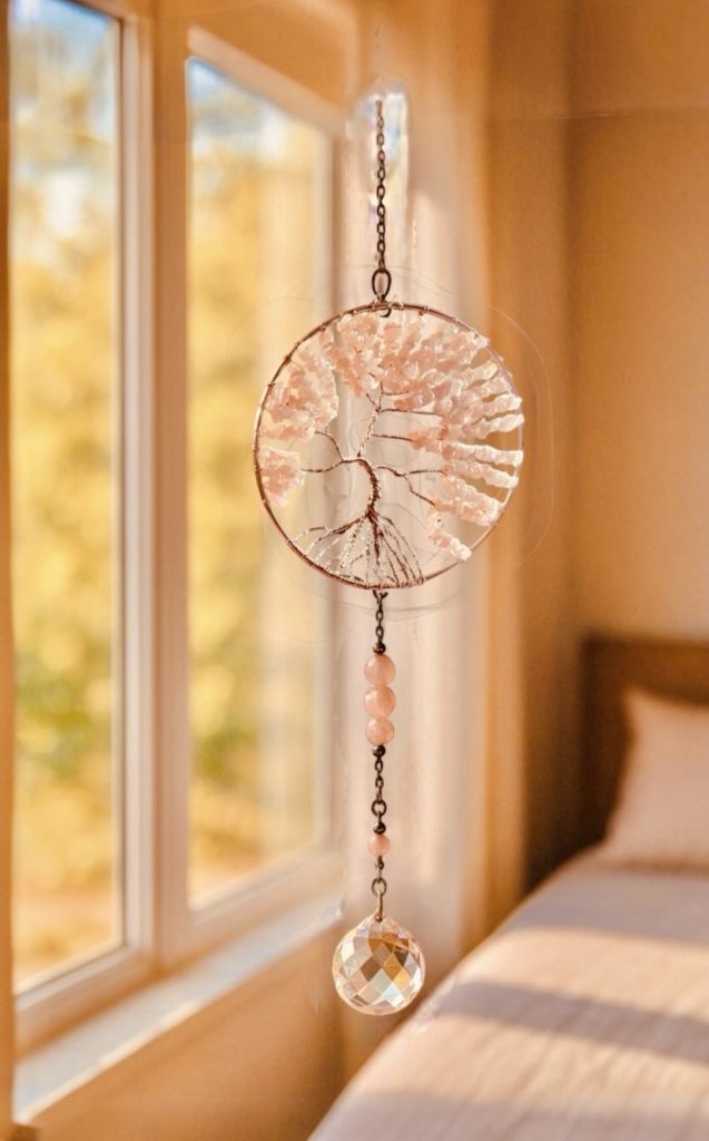 ✨ Atrapasol Árbol de la Vida en cuarzo rosa — símbolo de amor y armonía. Su esfera de cristal proyecta destellos mágicos que llenan tu espacio de luz y energía positiva.