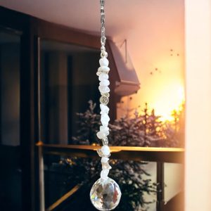 Elaborado con piedras de cuarzo blanco y un prisma de cristal que refleja la luz del sol. Un diseño delicado que llena tu espacio de claridad ,Paz y armonía.