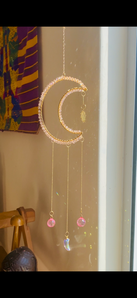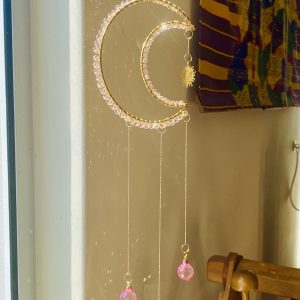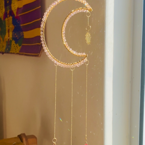 Elegante atrapasol , decorado con cristales facetados que reflejan la luz creando destellos mágicos. De sus finas cadenas cuelgan prismas en tonos rosados y una luna iridiscente, junto a un delicado sol dorado que aporta armonía y encanto. Ideal para colgar en ventanas y llenar tus espacios de luz y energía positiva.
