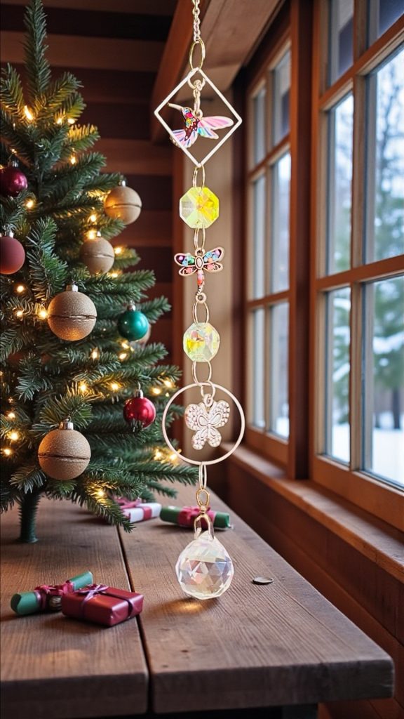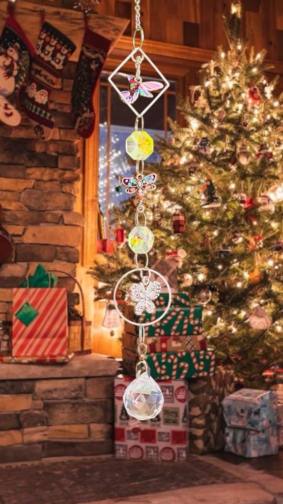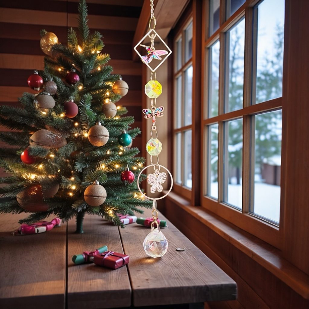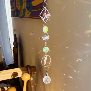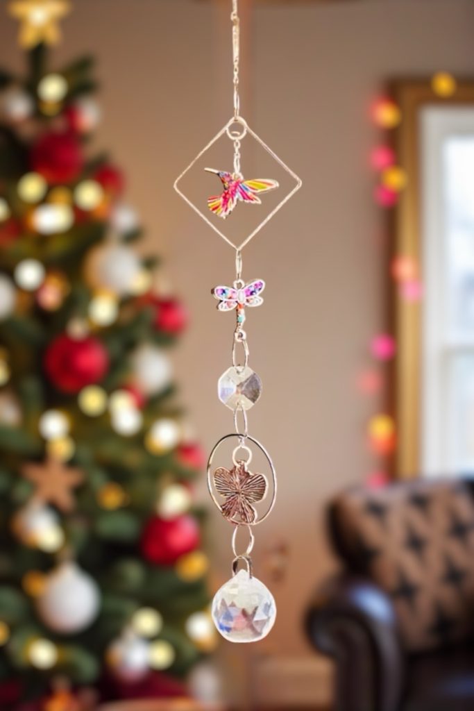 Este delicado atrapasol combina un colibrí en tonos alegres,una libélula con cristales verdes iridiscentes una mariposa y un brillante prisma final que proyecta destellos de luz al recibir el sol. Su diseño incorpora formas geométricas y detalles metálicos que realzan su estilo encantador y luminoso. Perfecto para llenar cualquier espacio de armonía, color y energía positiva.
