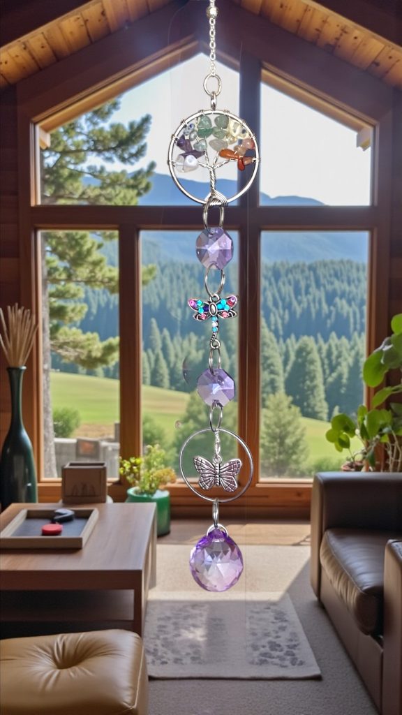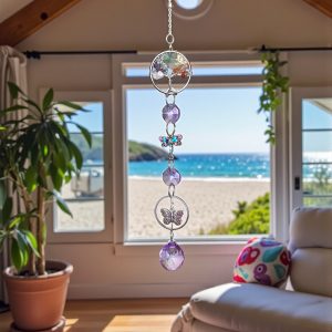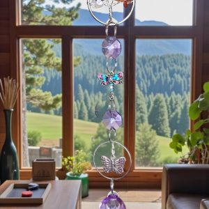 Atrapasol decorativo con cristales facetados en tonos violetas que reflejan la luz creando destellos suaves y armoniosos. Incorpora detalles de mariposa y libélula, símbolos de cambio y renovación, junto a un delicado Árbol de la Vida con piedras naturales. Ideal para colgar en ventanas, terrazas o espacios de descanso, aportando luz, color y una energía tranquila al ambiente.