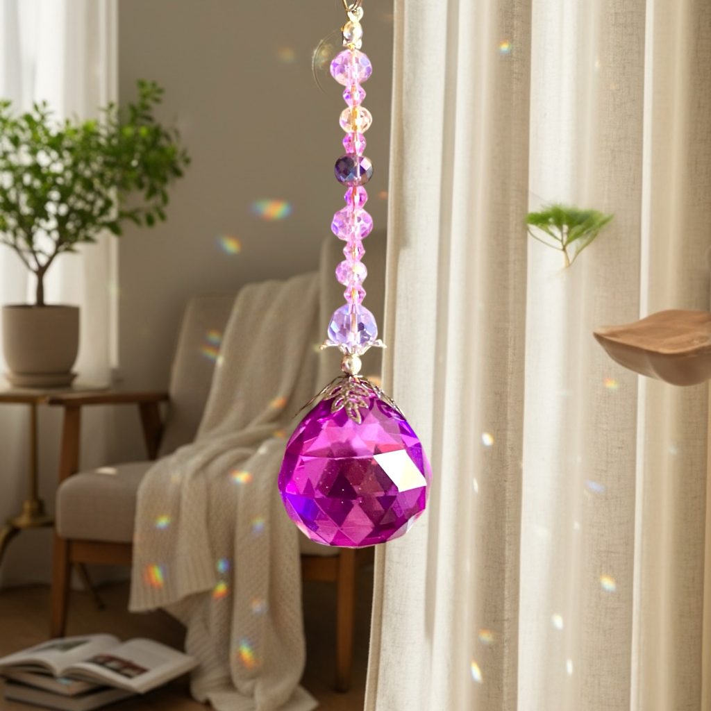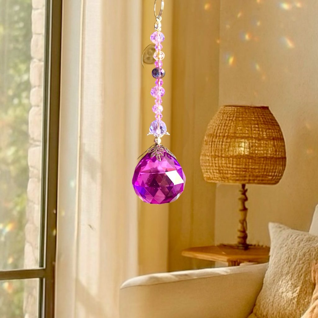 Atrapasol con esfera facetada en tono violeta,acompañado de cristales austriacos transparentes y tornasolados que realzan su brillo. Al recibir la luz, proyecta destellos llenos de color, creando un ambiente mágico y armónico en tu hogar.