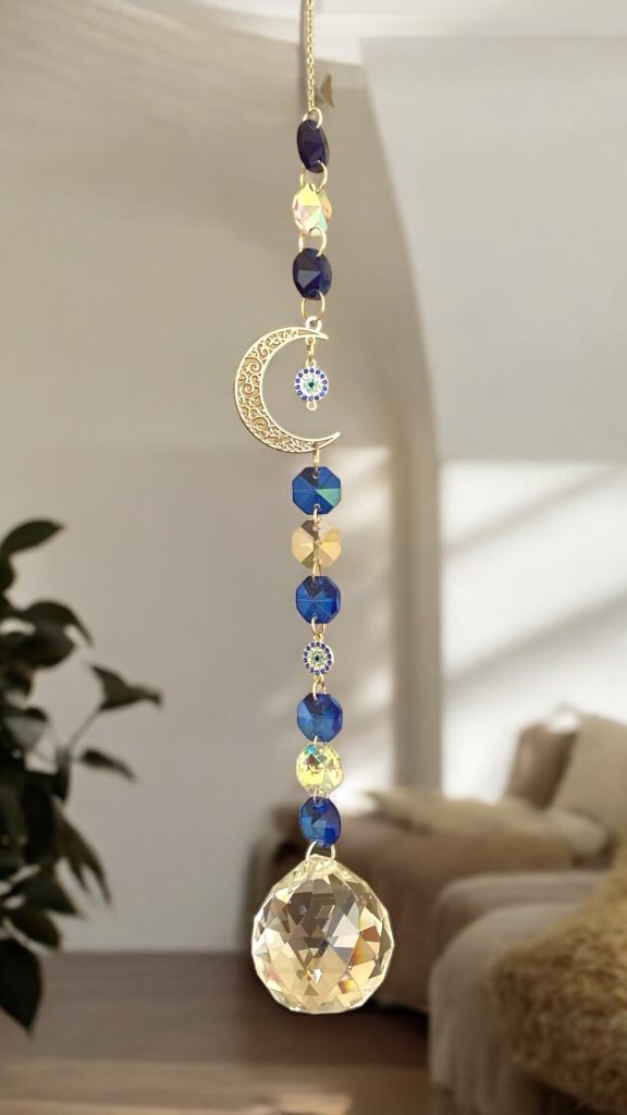 ✨atrapasol con luna plateada,cristales facetados en tonos azul y transparentes