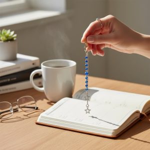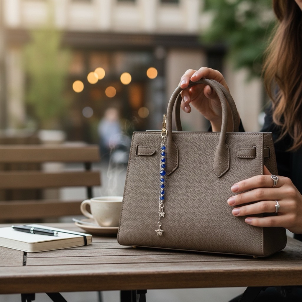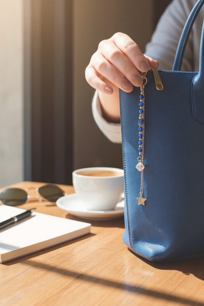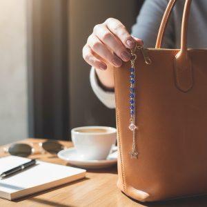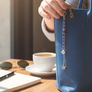 Un delicado accesorio diseñado con cristales para dar un toque de elegancia y magia a tus bolsos. Elaborado con cuentas azul profundo y detalles metálicos en tono plata, finaliza en una estrella colgante que simboliza guía, claridad y buena energía. Perfecto para complementar tu estilo y llevar un pequeño brillo contigo a donde vayas.