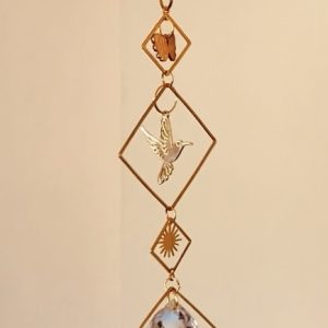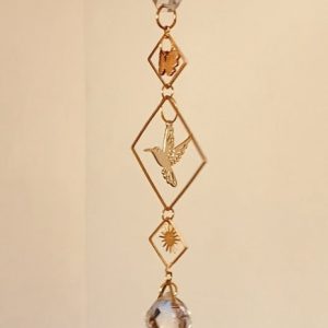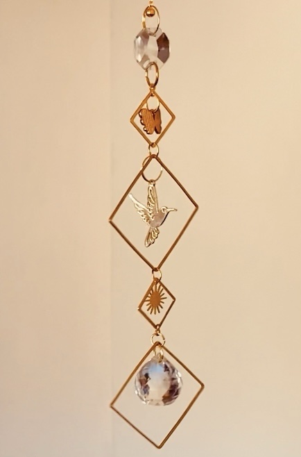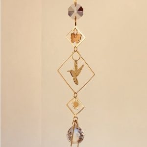 Colibrí en tono dorado ,acompañado de graciosa mariposa y cristales los cuales al dan hermosos destellos de los colores del arco Iris cuando los rayos del sol los atraviesan.