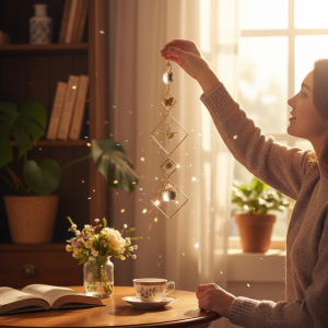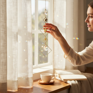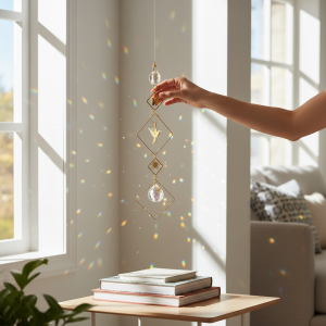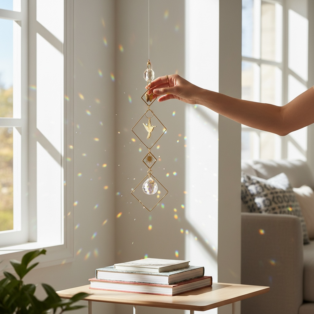Colibrí en tono dorado ,acompañado de graciosa mariposa y cristales los cuales al dan hermosos destellos de los colores del arco Iris cuando los rayos del sol los atraviesan.