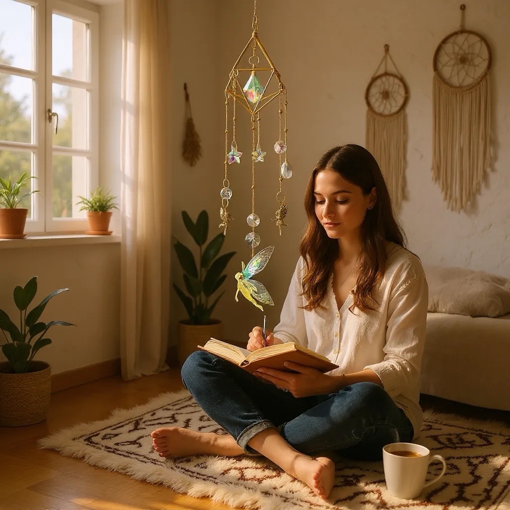 Un diseño mágico y lleno de luz, con estructura geométrica dorada y cristales austriacos que reflejan destellos multicolores en cada rincón. Destaca la figura de un hada luminosa que aporta encanto y energía positiva al ambiente. Ideal para decorar tu hogar con un estilo boho, atrayendo paz, armonía y un toque de fantasía.