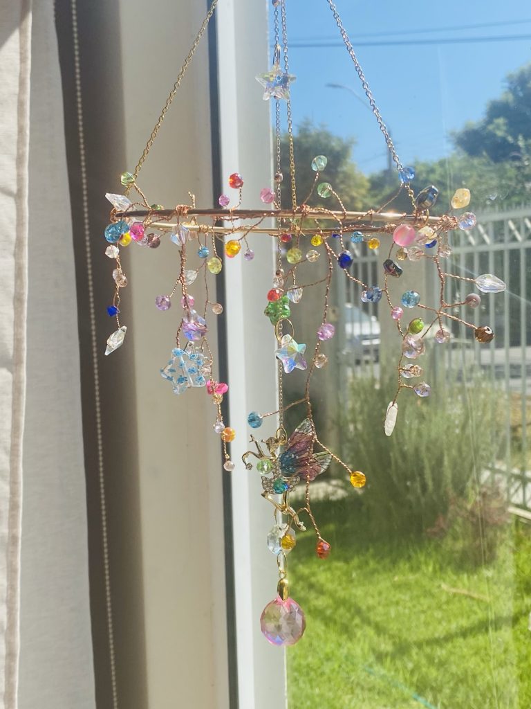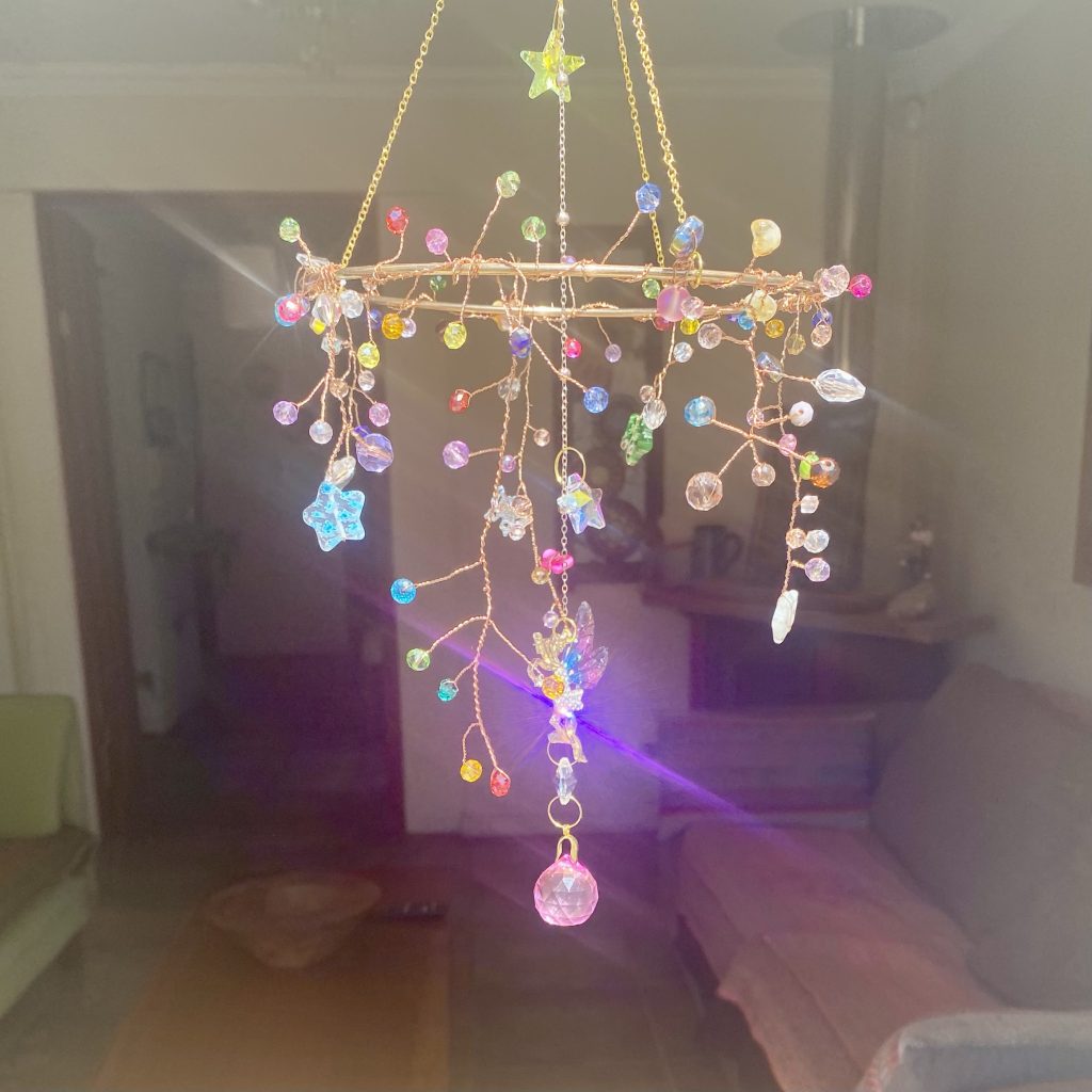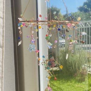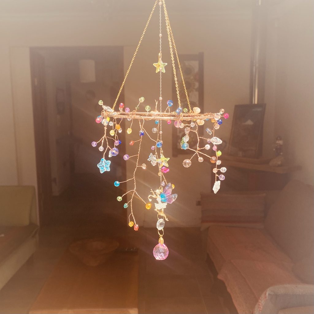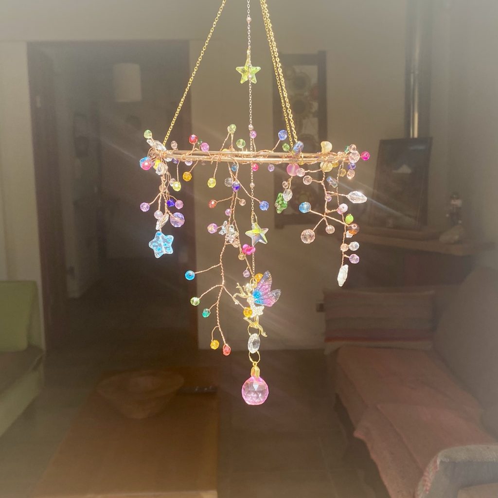 Este delicado atrapasol ha sido creado como un pequeño universo mágico donde las hadas habitan entre cristales de colores, reflejando alegría, armonía y energía luminosa en cada rincón de tu hogar.