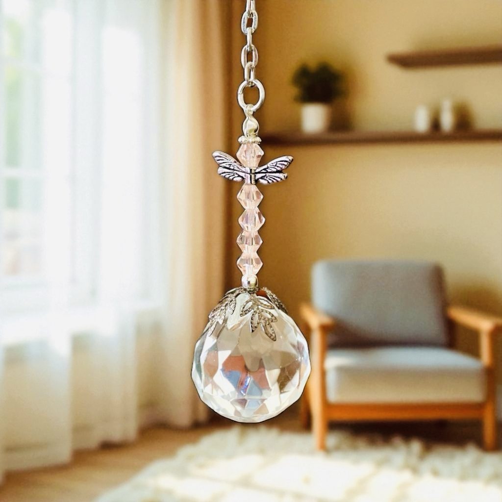 ✨ Atrapasol libélula Rosada elaborada con cristales austríacos en ✨ hecho a mano, proyecta destellos vibrantes que llenan tu hogar de magia, armonía y energía positiva.✨