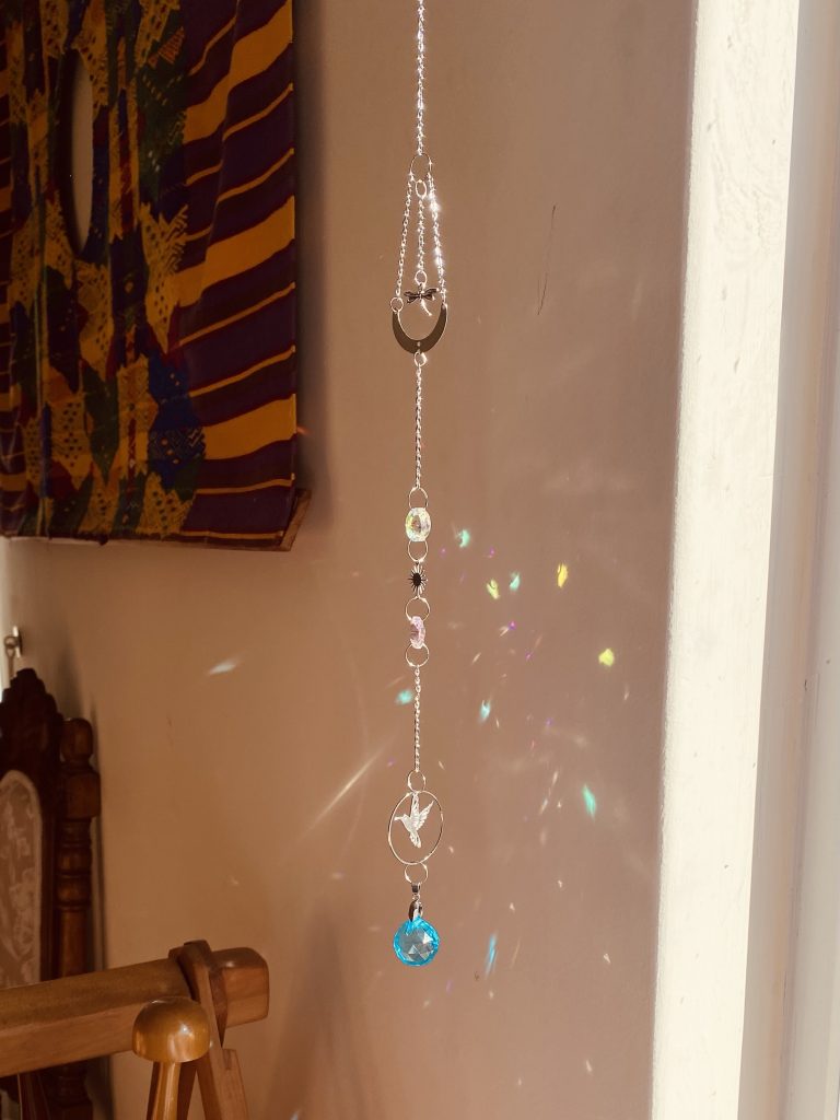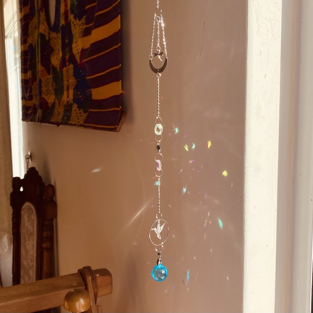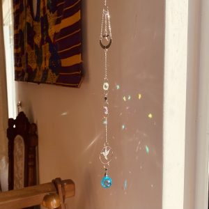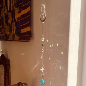 Delicado Atrapasol con cristales octagonales y prisma en color turquesa .