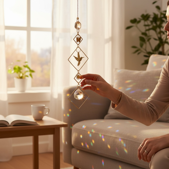 Delicado Atrapasol con cristales octagonales y prisma en color turquesa .