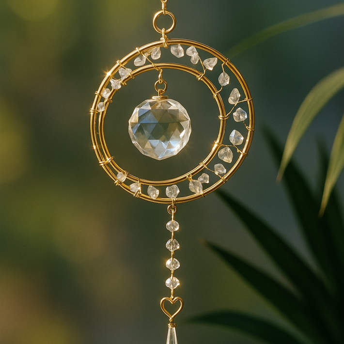 Media luna cubierta de cristales transparentes que capturan la luz como estrellas. Un diseño elegante y mágico para colgar cerca de tu ventana favorita.