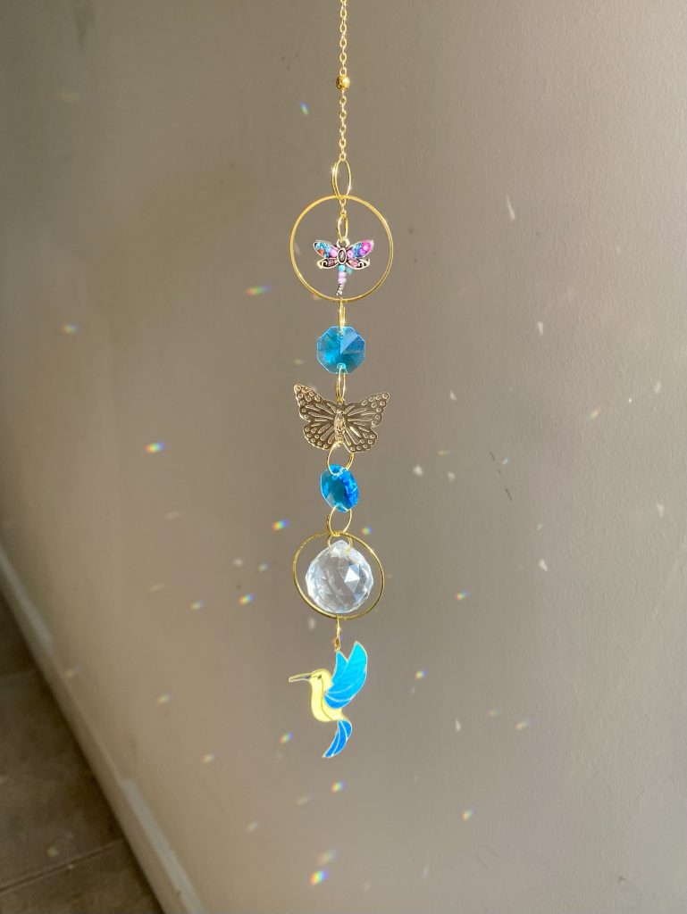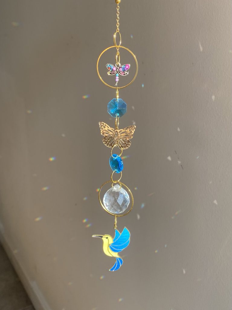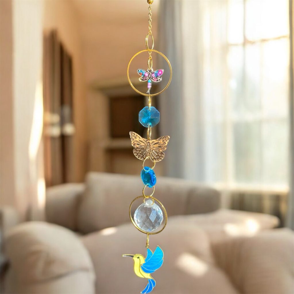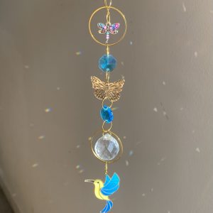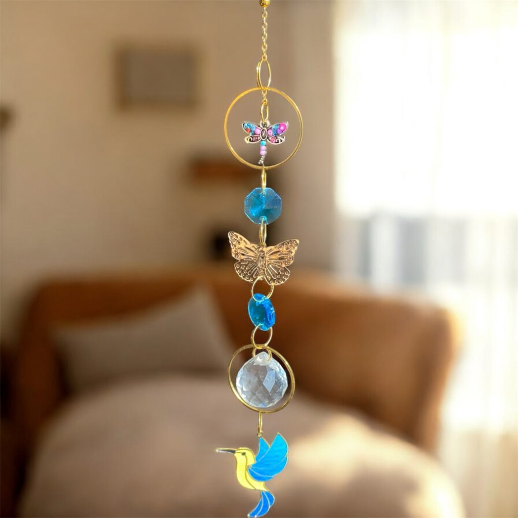 Este atrapasol combina símbolos de transformación y guía espiritual: la libélula y la mariposa representan el cambio consciente y la evolución del alma, mientras el colibrí simboliza la alegría, la resiliencia y los mensajes de luz.