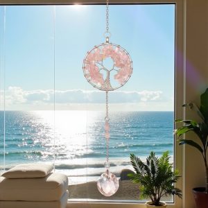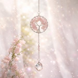 Atrapasol Árbol de la Vida elaborado con cuarzo rosado, símbolo del amor, la armonía y la sanación emocional. Al recibir la luz, proyecta destellos suaves que elevan la energía del espacio y conectan con el amor propio y la calma interior.