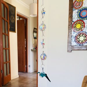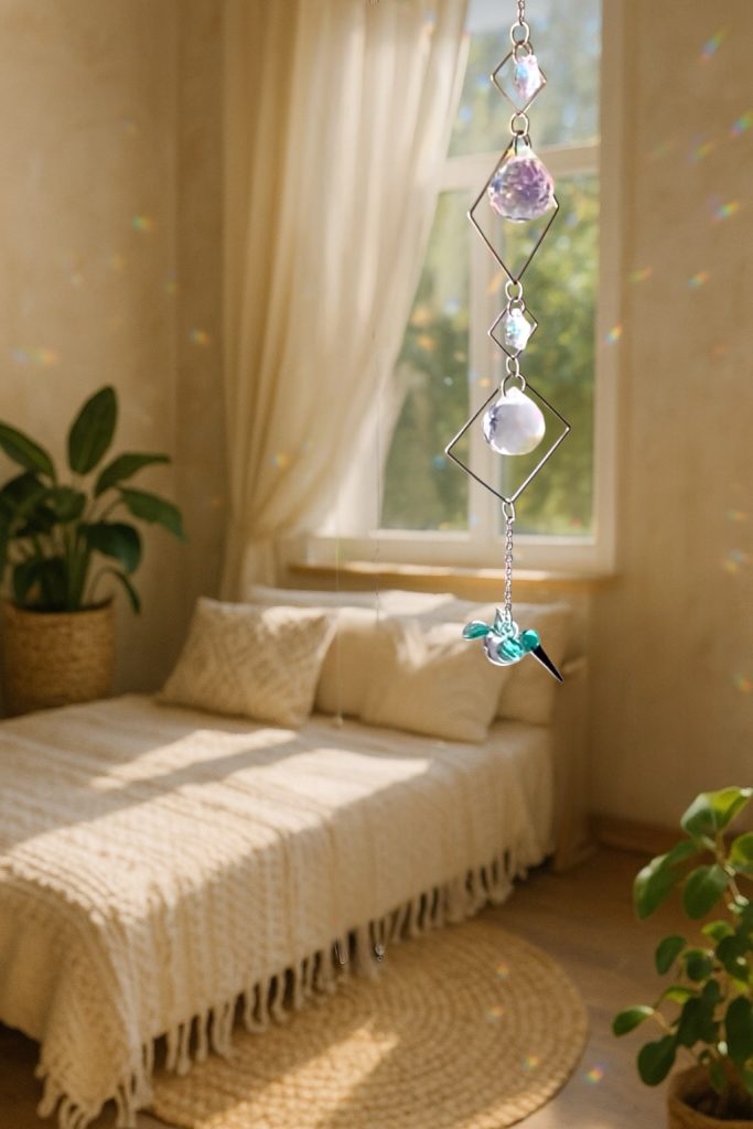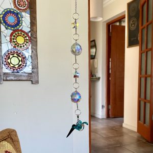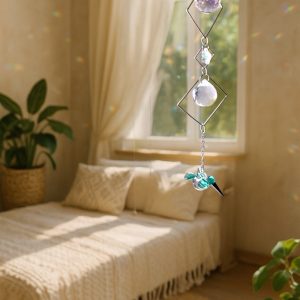 Atrapasol con diseño elegante en cristales tallados de alta calidad, montados en figuras geométricas que reflejan la luz en destellos vibrantes. En el extremo, un delicado colibrí de cristal en tonos turquesa agrega un toque de vida y armonía, simbolizando alegría y energía positiva para tu hogar.